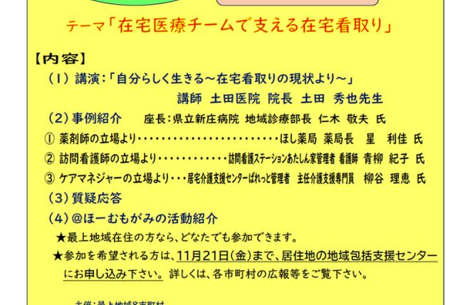 最上地域のみなさんと医療・介護従事者のために、在宅医療での不安やお悩みへの相談窓口の設置、医療資源情報の提供、在宅医療・介護に関する各種講習会の開催など、在宅療養環境のサポートを行っています。